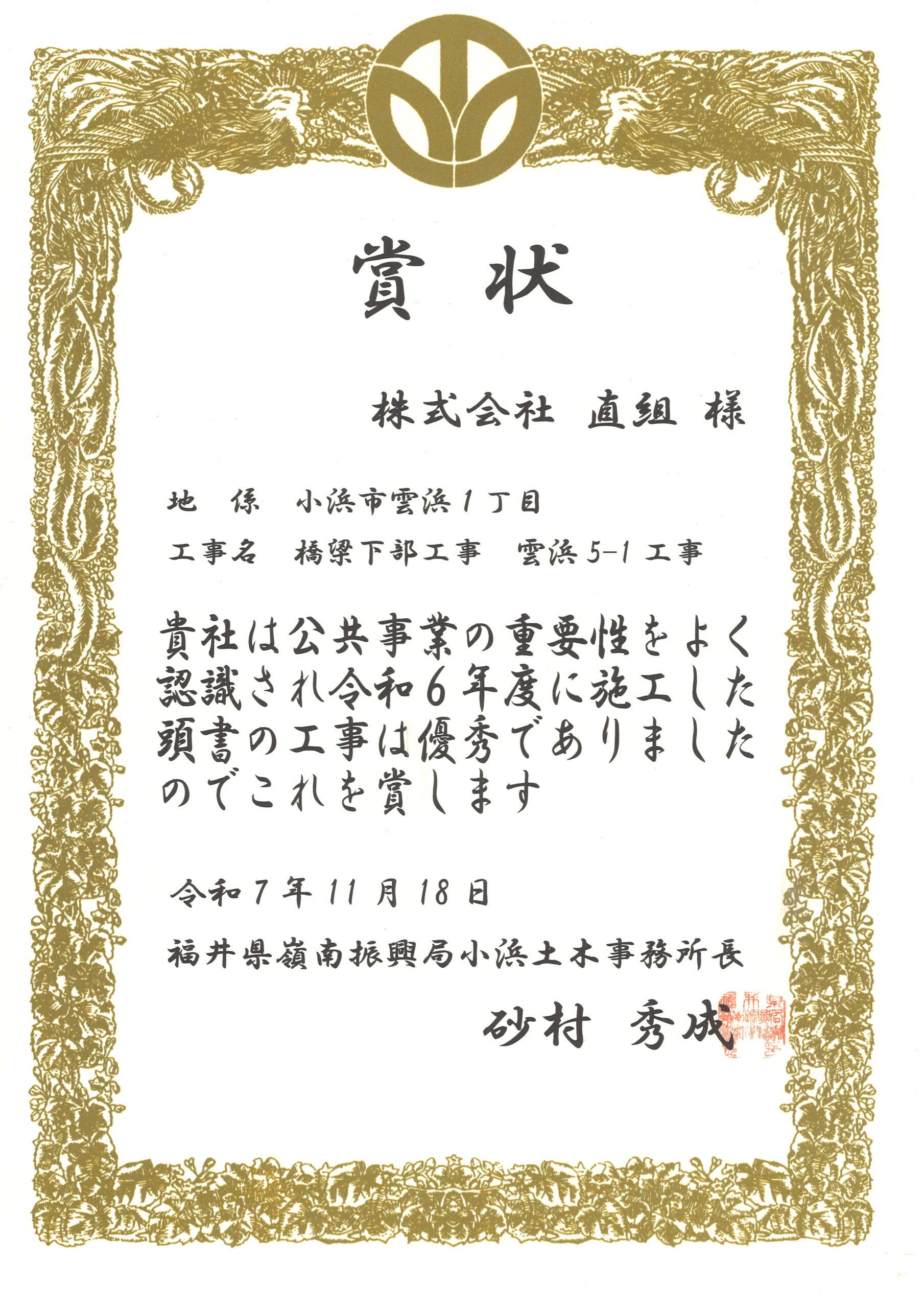 優良工事 小浜土木事務所長賞